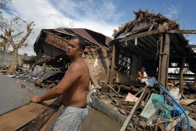 5日,在菲律賓阿爾拜省的一個村莊,災民在整理被臺風毀壞的房屋殘骸。菲律賓國家救災協(xié)調委員會5日宣布,強臺風“榴蓮”在菲律賓造成的死亡人數已上升至526人,失蹤者增加到740人。