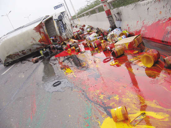 昨天(本網編注:12月6日)下午2點左右,一輛滿載油漆的中型面包車在行駛到南京緯七路高架橋鳳臺路段時,突然與一輛平板車相撞,面包車側翻在地,上百罐油漆傾瀉下來,一時間柏油路上色彩斑斕,散發(fā)出刺鼻的油漆味。很快,交警趕來處理。