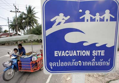 在泰國攀牙府,當(dāng)?shù)鼐用耱T摩托車經(jīng)過海嘯警示牌。印度洋海嘯發(fā)生近兩年來,受災(zāi)各國采取各種預(yù)警方式,降低災(zāi)難風(fēng)險(xiǎn)。