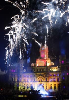 23日晚,五彩繽紛的圣誕煙花“盛開”在西班牙首都馬德里的夜空中。新華社/法新 |