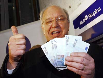 2007年1月1日,在斯洛文尼亞首都盧布爾雅那,斯洛文尼亞財政部長安德烈·巴尤克展示剛剛從自動取款機中取出的歐元紙幣。當天,斯洛文尼亞正式加入歐元區(qū),成為歐元區(qū)第13個成員國。