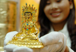 近日,“西藏貴金屬文化藏品推展”在北京菜百商場亮相,展出了具有西藏文化特色的黃金收藏品以及傳統(tǒng)工藝品。其中,限量發(fā)售的金佛頗為引人注目。圖為在北京菜百商場,一名藏族女孩展示一尊金佛。