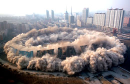始建于1988年的五里河體育場(chǎng)是一個(gè)能容納近六萬人的體育場(chǎng)。2001年10月7日,中國(guó)足球隊(duì)在這里戰(zhàn)勝阿曼隊(duì)后,提前獲得2002年世界杯決賽階段入場(chǎng)券,這是中國(guó)足球第一次進(jìn)軍世界杯決賽階段。2006年初,沈陽市政府決定,異地修建一座全新的足球場(chǎng)承辦奧運(yùn)會(huì)比賽,將五里河體育場(chǎng)爆破拆除。圖為2月12日,沈陽五里河體育場(chǎng)在下午3時(shí)整被成功爆破拆除。 |