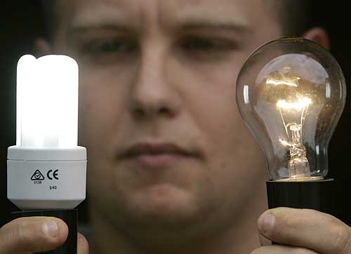 27日,在澳大利亞悉尼,電器推銷員戴夫·埃雷特手舉一只舊式白熾燈泡(右)和一只新型節(jié)能燈泡。根據澳大利亞政府2月20日公布的一項決定,由于新型節(jié)能燈可以節(jié)約更多資源并且減少溫室氣體排放量,它將逐步取代舊式白熾燈泡。
