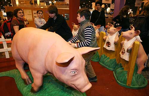 3日,在法國(guó)巴黎舉行的國(guó)際農(nóng)業(yè)博覽會(huì)上,一個(gè)用豬模型布置的展臺(tái)吸引了不少觀眾。當(dāng)天,為期9天的第44屆法國(guó)國(guó)際農(nóng)業(yè)博覽會(huì)在巴黎凡爾賽門(mén)展覽中心開(kāi)幕。法國(guó)國(guó)際農(nóng)業(yè)博覽會(huì)始于1964年,是世界著名的大型農(nóng)業(yè)博覽會(huì)之一,每年該博覽會(huì)的參觀人數(shù)都多達(dá)數(shù)十萬(wàn)。 |