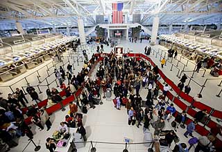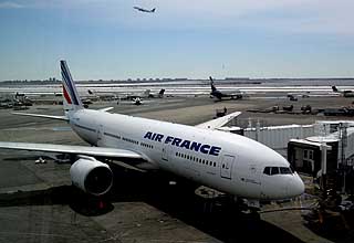 左圖:3月19日,一架法航客機(jī)在美國(guó)紐約肯尼迪國(guó)際機(jī)場(chǎng)停泊。 右圖:3月19日,旅客在美國(guó)紐約肯尼迪國(guó)際機(jī)場(chǎng)排隊(duì)等待安檢。 |