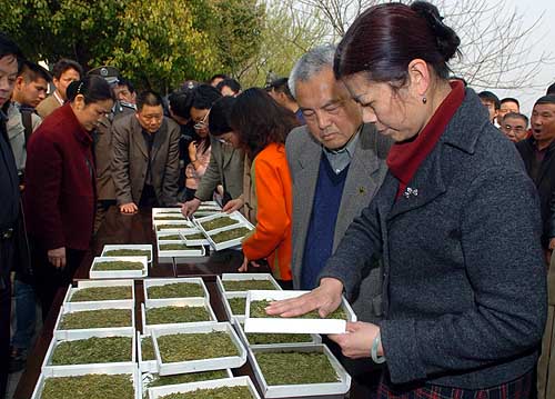 3月22日,茶葉專(zhuān)家正在現(xiàn)場(chǎng)查看剛剛炒制出來(lái)的西湖龍井茶的色澤。當(dāng)天,2007年西湖龍井炒茶技藝大賽在杭州舉行,30多位來(lái)自西湖龍井茶區(qū)的炒茶高手爭(zhēng)奪2007年“炒茶王”桂冠,比賽結(jié)束后,經(jīng)過(guò)專(zhuān)家組對(duì)茶葉色澤、香氣、湯味等指標(biāo)的嚴(yán)格評(píng)選,最后精選的200克極品西湖龍井“茶王茶”當(dāng)場(chǎng)被買(mǎi)家以11萬(wàn)元的天價(jià)拍走。 |