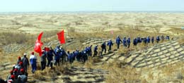 圖為排著長隊的寧夏銀川市學生走進毛烏素沙地參加義務(wù)治沙造林活動。
