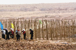 近日,寧夏與國家林業(yè)局簽訂“十一五”防沙治沙目標責任書。根據(jù)責任書要求,寧夏將安排專項資金用于防沙治沙工作,且每年資金投入增幅不得低于5%。圖為3月30日,幾位農民在毛烏素沙地生態(tài)林項目區(qū)內種植耐旱樹木。
