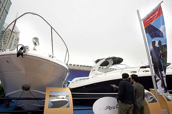 4月5日,參觀者在參展游艇前駐足。當日,2007中國(上海)國際游艇展在上海展覽中心開幕,來自世界各地的70多艘各式游艇實船參展,除了有頂級的豪華游艇外,各式中、低價游艇紛紛亮相,成為亮點。