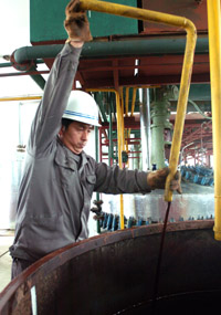 近日,江西新時代油脂工業(yè)有限公司創(chuàng)新工藝、自行設(shè)計生產(chǎn)的生物柴油生產(chǎn)線投產(chǎn),預計年生產(chǎn)能力可達1.8萬噸。這種創(chuàng)新工藝生產(chǎn)出的生物柴油可單獨或混合石化柴油供車輛使用。這種新工藝為廢油再利用提供了新出路。圖為工作人員在生物柴油生產(chǎn)線上操作。