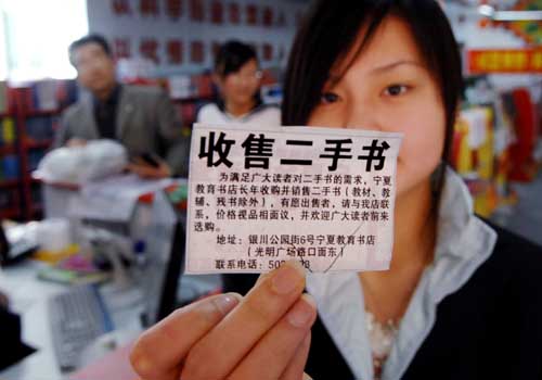 近日,銀川市教育書店增設(shè)收售“二手書”業(yè)務(wù),在提倡書籍循環(huán)再利用、環(huán)保節(jié)能的同時,也滿足了部分低收入讀者對書籍換購的需求。圖為銀川市教育書店工作人員正在介紹收售“二手書”的小告示。
