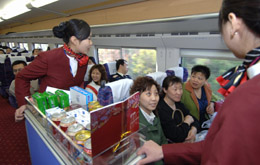 4月18日,乘務(wù)員在“和諧號(hào)”動(dòng)車(chē)組D581次列車(chē)上為旅客服務(wù)。
