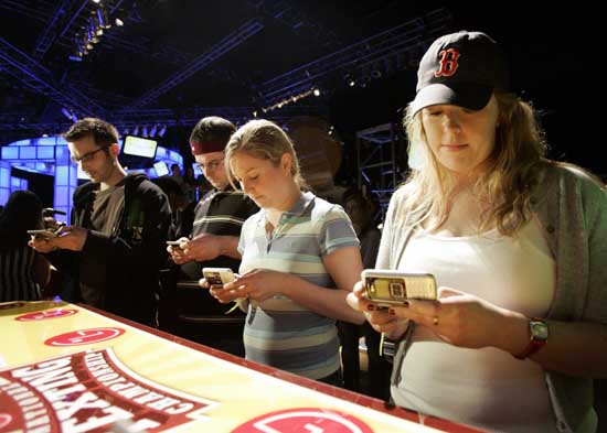 21日,在美國(guó)紐約,幾名參加手機(jī)短信比賽的選手在發(fā)短信。當(dāng)日,在一家手機(jī)公司舉辦的手機(jī)短信比賽上,一名來自賓夕法尼亞州的13歲的小女孩獲得“東海岸冠軍”。屆時(shí),她將與來自洛杉磯的“西海岸冠軍”爭(zhēng)奪最后的勝利。