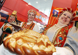 4月18日,俄羅斯客商在國(guó)際經(jīng)貿(mào)旅游節(jié)上展示俄羅斯食品。當(dāng)日,2007中國(guó)·揚(yáng)州“煙花三月”國(guó)際經(jīng)貿(mào)旅游節(jié)在瘦西湖萬(wàn)花園景區(qū)開幕。
