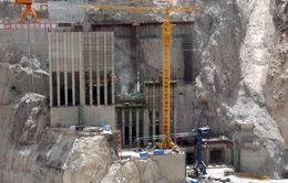 從20世紀(jì)80年代以來(lái),青海省不斷加快黃河水電資源開(kāi)發(fā)步伐,已在境內(nèi)相繼開(kāi)工建設(shè)了龍羊峽、李家峽、尼那、公伯峽、直崗拉卡、蘇只、康揚(yáng)、拉西瓦等大中型水電站,黃河青海段建成使用和在建的水電站總裝機(jī)容量已達(dá)1200多萬(wàn)千瓦。2020年前,青海省將基本完成黃河上游龍羊峽以下河段13座大中型水電站建設(shè),使青海成為國(guó)家“西電東送”的重要電源基地之一。圖中的拉西瓦水電站位于青海省貴德縣與貴南縣交界的黃河干流上,電站總裝機(jī)容量420萬(wàn)千瓦,是黃河流域裝機(jī)容量最大的水電站。 |