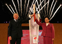 國務(wù)委員、北京奧組委第一副主席陳至立和國際奧委會第29屆奧運(yùn)會協(xié)調(diào)委員會主席維爾布魯根共同為北京奧運(yùn)會火炬揭幕。