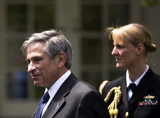 25日,世界銀行行長保羅·沃爾福威茨(左)在美國華盛頓白宮參加活動。歐洲議會當(dāng)天要求世界銀行行長沃爾福威茨辭職,向這名陷入“女友門”丑聞的高官施加更大壓力。