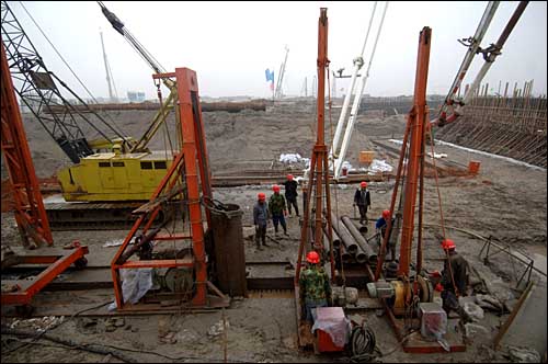 5月11日,工人在位于河北唐山的首鋼曹妃甸新廠5500立方米煉鐵高爐建設(shè)工地施工。 首鋼曹妃甸新廠于2007年3月12日正式開工建設(shè),目前工程進展順利。據(jù)介紹,新廠2008年實現(xiàn)一半鋼產(chǎn)量投產(chǎn),2010年全部投產(chǎn)。