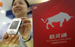 5月22日,一位工作人員在武漢廣場電信城向顧客推薦一款股票交易手機(jī)。隨著股市火爆,具有炒股交易功能的手機(jī)也開始俏銷。通過下載運(yùn)營商提供的股票軟件,投資者就可以通過此類手機(jī)查看股票行情或?qū)崿F(xiàn)股票買賣交易。