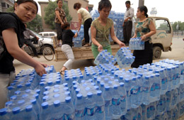 5月30日,無錫個體商戶正在搬運從上海調(diào)來的純凈水,準備出售。 從5月29日開始,江蘇無錫市城區(qū)的大批市民家中自來水水質(zhì)突然發(fā)生變化,并伴有難聞的氣味,無法正常飲用。各方監(jiān)測數(shù)據(jù)顯示:今年入夏以來,無錫市區(qū)域內(nèi)的太湖出現(xiàn)50年以來最低水位,加上天氣連續(xù)高溫少雨,太湖水富營養(yǎng)化較重,諸多因素導(dǎo)致藍藻提前暴發(fā),影響了自來水水源地水質(zhì)。目前,無錫市民飲用水緊張,有關(guān)方面專家正趕往無錫研究對策。