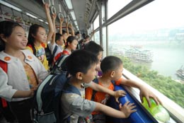 5月29日,20名受助的山區(qū)貧困兒童乘坐輕軌列車觀賞沿途風(fēng)景。當(dāng)日,重慶市慈善總會開展“情系山區(qū)兒童‘六一’手拉手”活動,將20名受助的銅梁縣山區(qū)貧困兒童接到城市里,組織他們參觀動物園、乘坐輕軌列車,還贈送給孩子們學(xué)習(xí)用品等節(jié)日禮物。