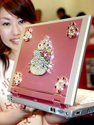 6日,日本電子業(yè)巨頭NEC公司員工在東京展示該公司新推出的一款筆記本電腦。這款筆記本電腦配有15.4英寸液晶屏,外殼上鑲有由施華洛世奇水晶組成的凱蒂貓(Hello Kitty)造型飾物,中央處理器采用美國超威(AMD)公司生產(chǎn)的閃龍芯片。該產(chǎn)品預(yù)計將于6月19日上市。