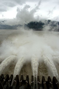 6月19日,江水通過三峽泄洪壩下泄。受連日來長(zhǎng)江上游大部分地區(qū)連降大雨影響,6月19日8時(shí),三峽入庫流量達(dá)到33000立方米/秒,出現(xiàn)今年以來最大汛情。三峽工程2007年防洪度汛方案已正式實(shí)施。