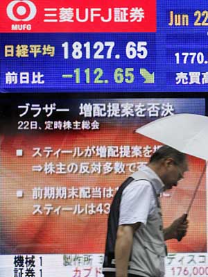6月22日下午2點(diǎn)左右(北京時(shí)間下午1點(diǎn)左右),一名行人從日本東京一塊股票交易顯示牌前走過,上面顯示日經(jīng)指數(shù)較前日有大幅下跌。