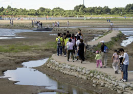 7月19日,由于江水下降,松花江南岸通向江心島的小路已完全露出水面。
