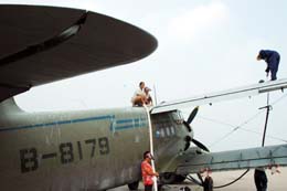 7月16日,焦作市森防工作人員在為農(nóng)用飛機(jī)裝添農(nóng)藥。近日,河南省焦作市25萬畝農(nóng)田防護(hù)林發(fā)生嚴(yán)重蟲害。當(dāng)?shù)卣o急租用2架農(nóng)用飛機(jī),噴灑農(nóng)藥滅殺森林害蟲。