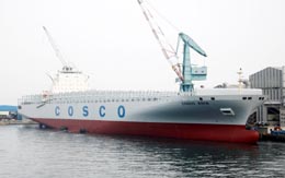 7月26日,中國最大的集裝箱船“中遠(yuǎn)亞洲”輪停泊在韓國蔚山的現(xiàn)代重工造船廠碼頭。當(dāng)天,中國遠(yuǎn)洋運輸(集團(tuán))總公司在這里為迄今中國最大的集裝箱船“中遠(yuǎn)亞洲”輪舉行命名儀式!爸羞h(yuǎn)亞洲”輪是中遠(yuǎn)集團(tuán)向韓國現(xiàn)代重工定購的四艘同型船中的首制船,總長349米,可裝載10062個20英尺標(biāo)準(zhǔn)集裝箱,總排水量14萬噸。 |