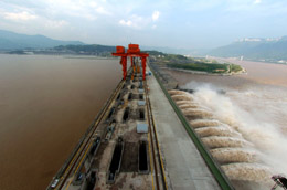 洪水通過(guò)三峽大壩下泄。