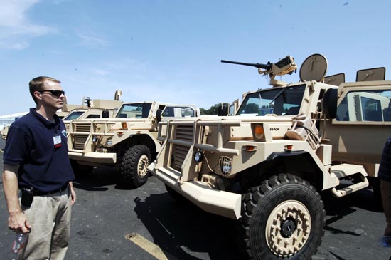 14日,一名參觀者在美國弗吉尼亞州舉行的軍事防護設備展上觀看軍用車。目前在伊拉克有1000余輛這種軍用車。當日,第六屆美國軍事防護設備展在弗吉尼亞州的斯塔福德地區(qū)機場舉行,來自全球的約600個參展商展出了各自的軍事防護設備。