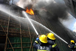 8月16日,上海消防人員在黃浦體育館滅火。當(dāng)天上午10點(diǎn)25分許,上海黃浦體育館突發(fā)大火,三至四樓的竹制腳手架大面積燃燒,當(dāng)時(shí)許多工人被困其中。10點(diǎn)30分,兩輛消防車趕到現(xiàn)場,10分鐘后火勢得到控制。事故原因及具體損失情況還在調(diào)查中。