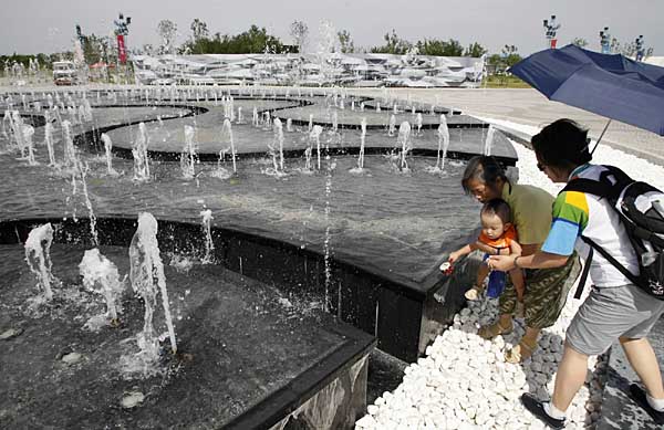 市民在水形噴水池邊戲水。順義奧林匹克水上公園不僅有64萬平方米的水面和近180萬立方米的水體,更布滿了與水有關(guān)的元素,如船形看臺(tái)、波浪形艇庫、槳橋、路燈等,這些設(shè)計(jì)理念無不來源于水,成為2008年奧運(yùn)會(huì)賽艇、皮劃艇、游泳公開水域賽場的亮點(diǎn)。