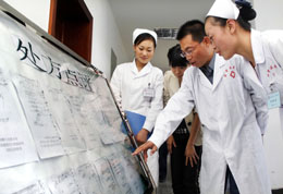 9月11日,寧夏中醫(yī)院醫(yī)護(hù)人員正在對(duì)公示處方進(jìn)行點(diǎn)評(píng)。近日,寧夏中醫(yī)院開展“工工整整處方