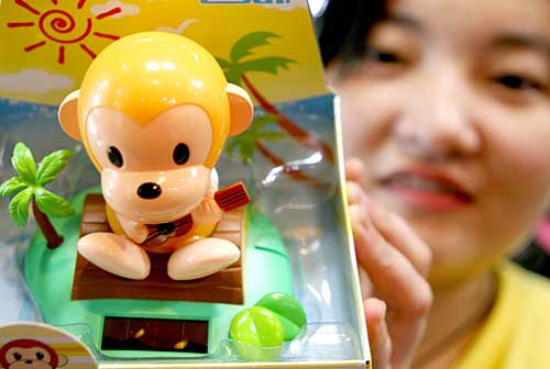 在安徽省淮北市一家商店,一位工作人員展示太陽能玩具。這種太陽能玩具的底座設(shè)有光線接收口,可以將陽光、燈光的光能轉(zhuǎn)換為電能,玩具會(huì)頻頻點(diǎn)頭,十分可愛,頗受消費(fèi)者喜愛。