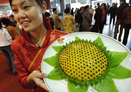11月1日,一家參展企業(yè)的工作人員向參觀者介紹糧食制品“葵花餅”。
