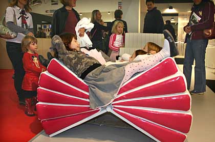 4日,小朋友們在意大利羅馬新國際展覽中心舉辦的家具展上體驗(yàn)新式沙發(fā)。為期9天的羅馬國際家具展當(dāng)天在羅馬新國際展覽中心閉幕。節(jié)省空間、新穎別致和極具人性化的設(shè)計風(fēng)格是本屆展會的突出特點(diǎn)。