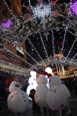 近日,雪人模特在亮燈儀式上。為慶祝即將來臨的圣誕節(jié),香港一家商場舉行圣誕亮燈儀式。