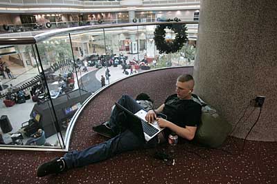 21日,一名乘客在美國亞特蘭大的哈茨菲爾德—杰克遜機場候機廳上網。每年11月的最后一個星期四是美國的感恩節(jié),這是美國人民獨創(chuàng)的節(jié)日,也是美國家庭吃團圓飯、共品火雞大餐的日子。今年的感恩節(jié)是11月22日。美國空運協會發(fā)布消息稱,今年為期12天的感恩節(jié)出行高峰從17日開始,預計有2700萬旅客搭乘商業(yè)航班出行,滿座率將達90%。