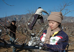 12月13日,河南農(nóng)業(yè)大學(xué)林學(xué)園藝學(xué)院的幾名大學(xué)生在果園幫助果農(nóng)修剪果樹。近日,河南農(nóng)業(yè)大學(xué)林學(xué)園藝學(xué)院的160名本科生和研究生,來到位于太行山腳下的河南省沁陽市紫陵鎮(zhèn)紫陵村萬畝無公害經(jīng)濟林園區(qū),開展為期一周的社會實踐活動。學(xué)生們對當(dāng)?shù)毓r(nóng)進行技術(shù)培訓(xùn),并幫助果農(nóng)對桃樹、杏樹、梨樹進行冬季剪枝管理。 |