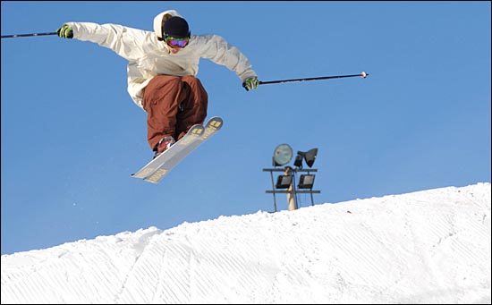 首屆中國大連國際溫泉滑雪節(jié)日前在大連安波溫泉滑雪場啟幕。圖為滑雪運(yùn)動(dòng)員現(xiàn)場進(jìn)行精彩的滑雪表演。
