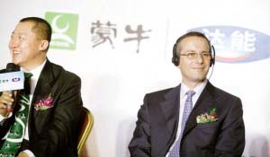 | 2006年12月18日,蒙牛攜手達(dá)能成立合資公司,圖為蒙牛集團(tuán)總裁楊文俊(左)與達(dá)能亞太區(qū)乳制品總裁顧德和在新聞發(fā)布會(huì)上。CFP圖片 | 繼10月16日光明乳業(yè)(600597)與法國(guó)達(dá)能集團(tuán)全面終止合作后,蒙牛乳業(yè)(2319.HK)與達(dá)能的合資項(xiàng)目也于12月18日宣告終止。分析人士認(rèn)為,達(dá)能與蒙牛分手預(yù)示著達(dá)能在中國(guó)投資策略發(fā)生變化。一些達(dá)能足夠強(qiáng)大的行業(yè),例如乳品,可以獨(dú)立地進(jìn)入新興市場(chǎng),不一定要通過(guò)合資企業(yè)。