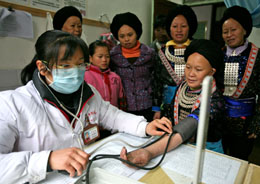 從11月開始,廣西融水縣開展2007年度新型農(nóng)村合作醫(yī)療健康體檢,醫(yī)務工作者分批深入苗家瑤寨,為34萬農(nóng)民免費全面體檢。