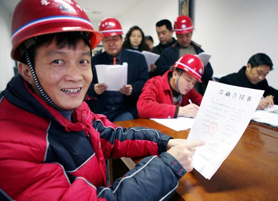 | 12月25日,農(nóng)民工與用工單位簽訂勞動(dòng)合同書(shū)。當(dāng)日,四川華鎣星星建設(shè)集團(tuán)按照2008年1月1日正式實(shí)施的《勞動(dòng)合同法》有關(guān)規(guī)定,與在集團(tuán)務(wù)工的1300多名農(nóng)民工分別簽訂了勞動(dòng)合同書(shū)。據(jù)悉,截至當(dāng)日,華鎣市已有2.8萬(wàn)名農(nóng)民工按照《勞動(dòng)合同法》的規(guī)定與用工單位正式簽訂了2008年度的勞動(dòng)用工合同。 | |