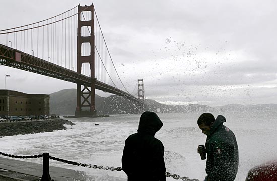 5日,在美國加利福尼亞州的舊金山,兩名男子站在金門大橋旁的岸邊上?耧L、暴雨和大雪4日至5日席卷加利福尼亞州,導致一些地區(qū)面臨洪水和泥石流威脅。