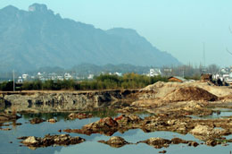 這是新安江源頭之一的橫江齊云山段。采砂后留下的砂堆與環(huán)境極不協(xié)調(diào)。不遠(yuǎn)處山脈就是國(guó)家級(jí)名勝風(fēng)景區(qū)齊云山(1月5日攝)。 地處新安江源頭的安徽省黃山市休寧縣,是皖南生態(tài)保護(hù)區(qū)的一部分。近年來,隨著一些重點(diǎn)建設(shè)工程的開工和當(dāng)?shù)亟?jīng)濟(jì)的發(fā)展,對(duì)砂石的需求量越來越大,導(dǎo)致該縣對(duì)境內(nèi)新安江源頭的兩條主要河流的砂石資源進(jìn)行過度開采,河床遭到挖掘、兩岸濕地被破壞、河流自身凈化能力下降,沿河水體生態(tài)鏈和周圍環(huán)境受到影響。 |