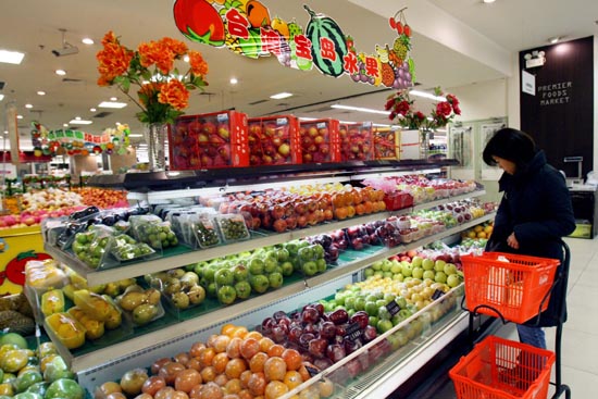 1月14日,顧客在上海一家大型超市的“臺灣寶島水果”專柜前選購。據(jù)悉,2008年春節(jié)期間將有包括蓮霧、青檬、芭樂、楊桃、柳丁等約100噸臺灣水果供應(yīng)上海市場。